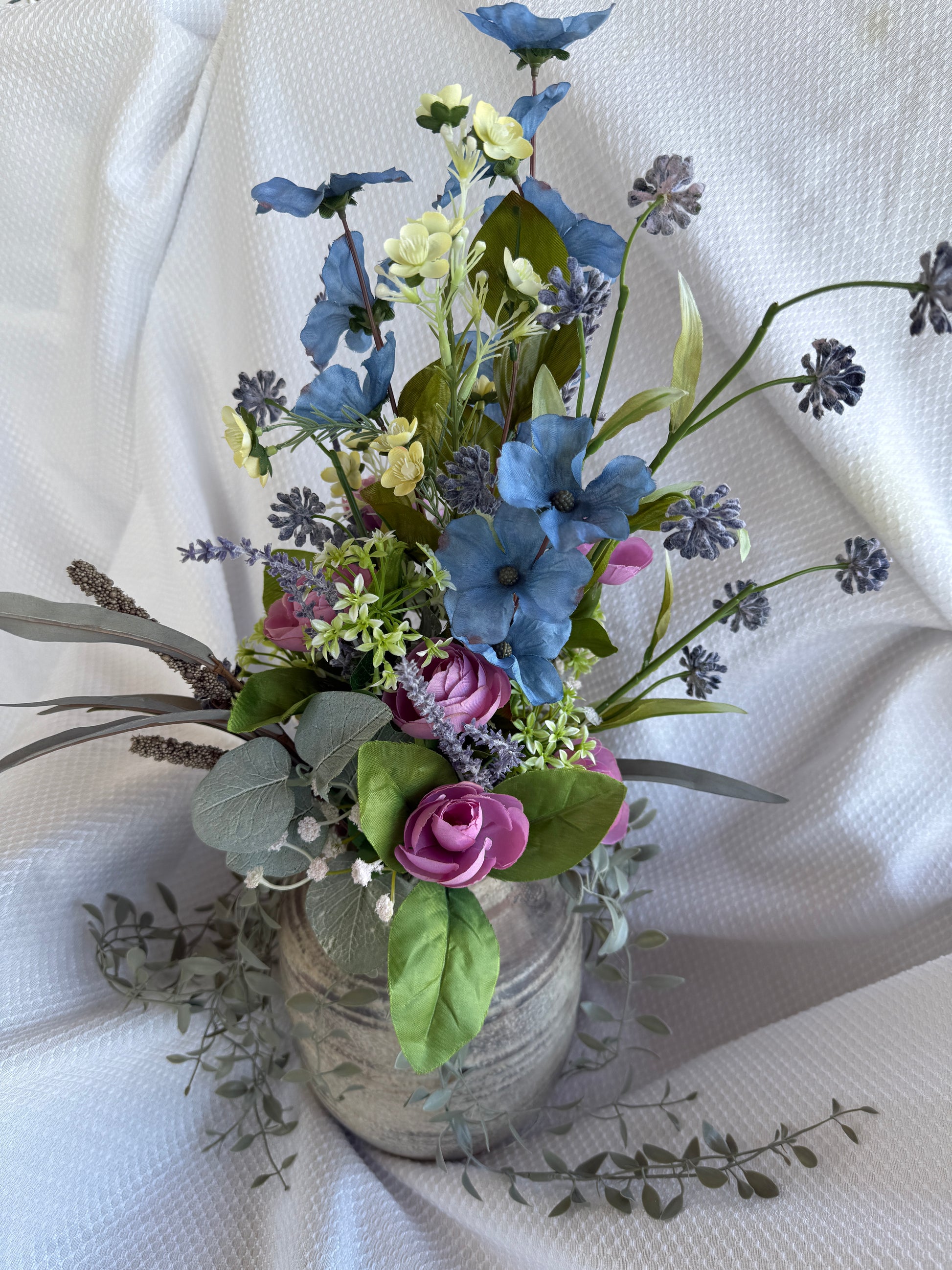 Soft and Sophisticated arrangement with cascading vines in an attractive clay container.