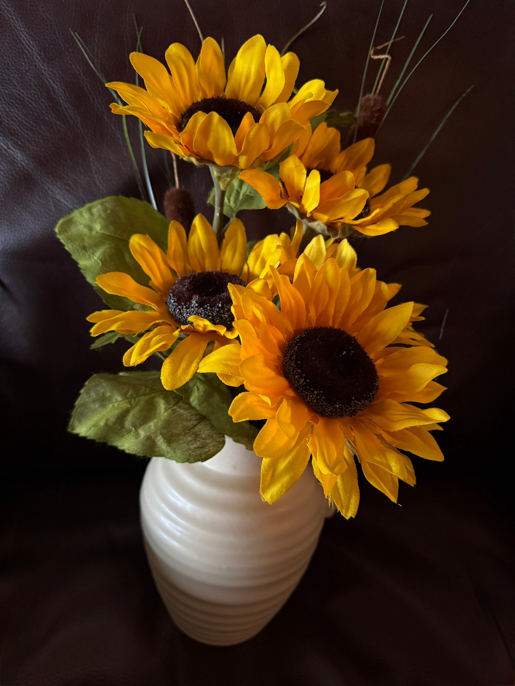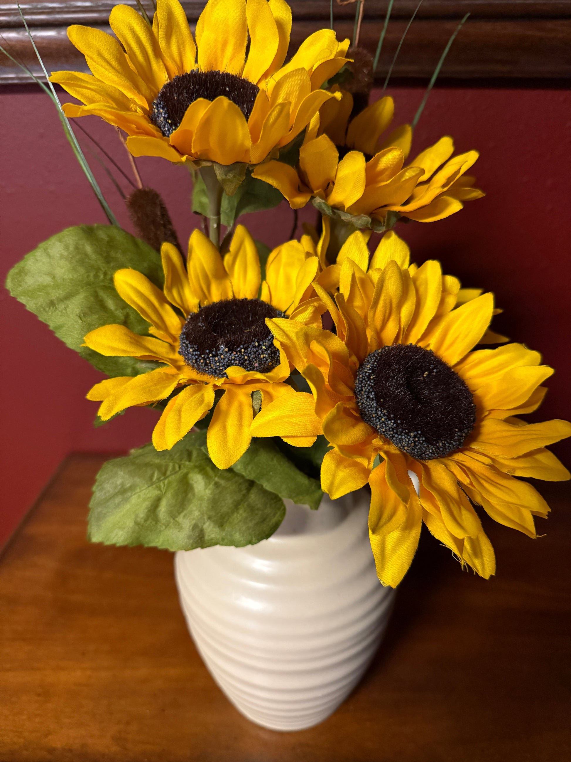 Sunflowers and cattails in a clay pitcher.