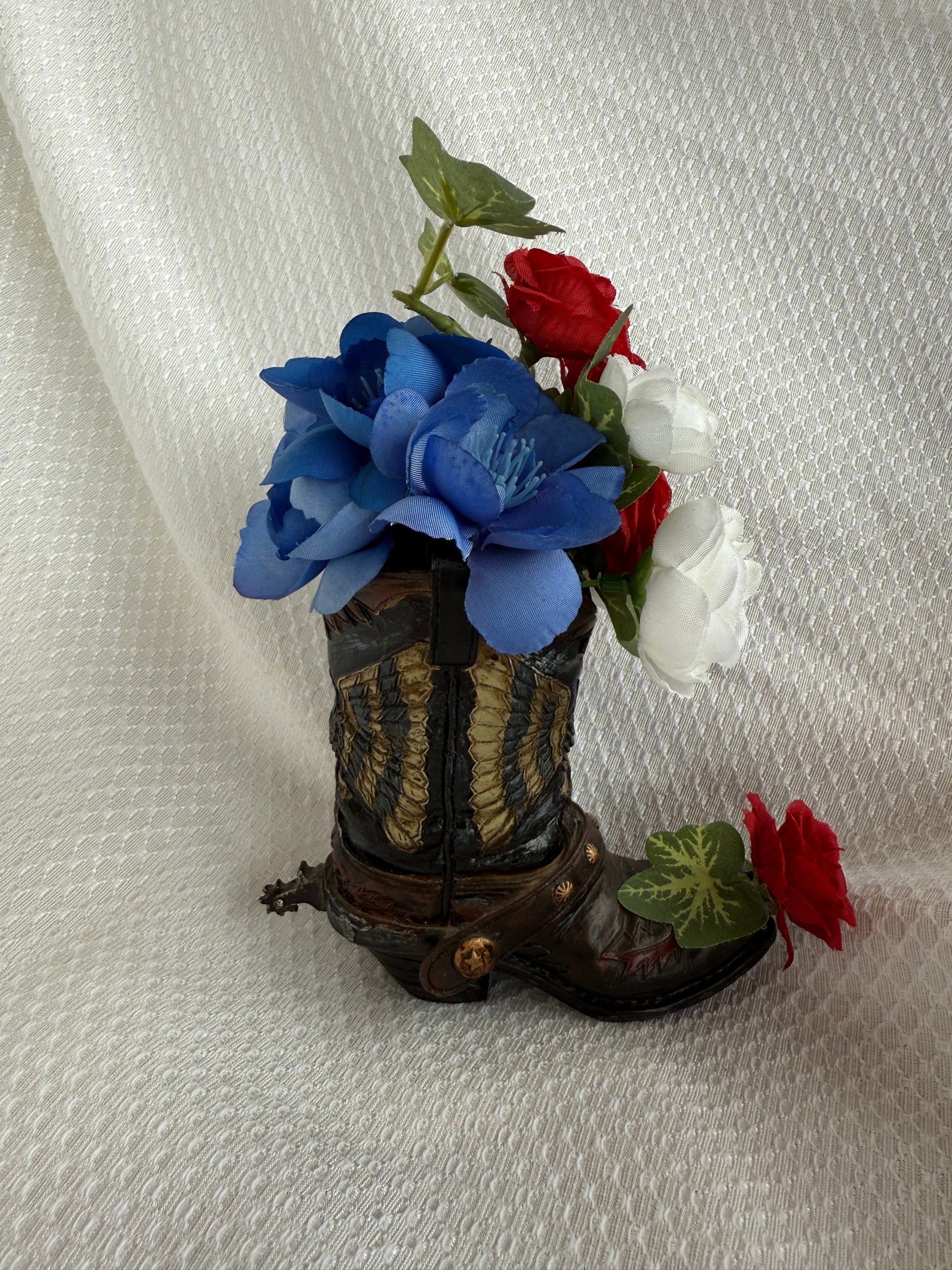 A touch of patriotism - red white and blue buds in a boot.
